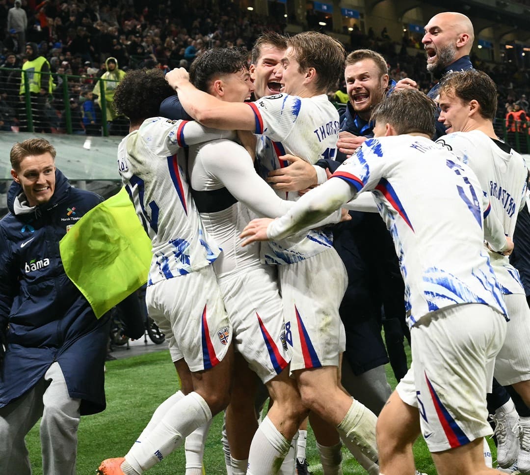 Para pemain Timnas Norwegia merayakan gol yang dicetak oleh Jorgen Strand Larsen pada laga kontra Timnas Italia. Senin, 17 November 2025--Instagram @uefaeuro