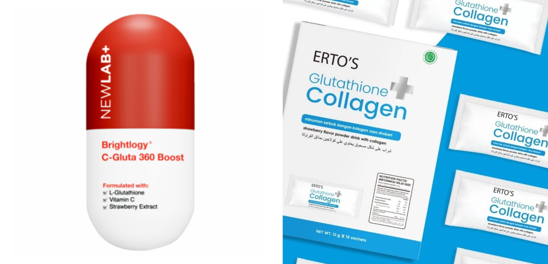 Suplemen dengan kandungan glutathione cocok untuk kulit kusam dan tidak merata. Pilihan produk yang populer termasuk NEWLAB Brightlogy C-Gluta 360 Boost dan ERTO’S Glutathione Collagen.