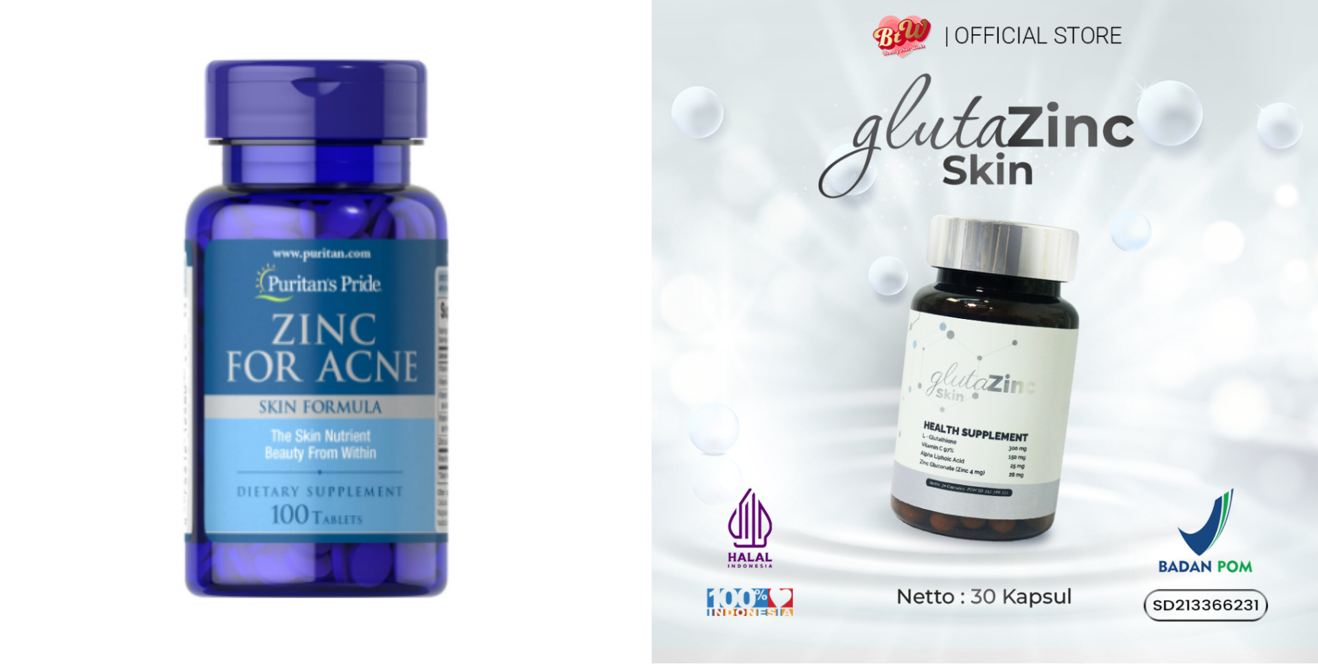 Suplemen zinc dari merek seperti Puritan's Pride Zinc for Acne atau Gluta Zinc Skin Supplement sering direkomendasikan untuk membantu menjaga keseimbangan kulit.