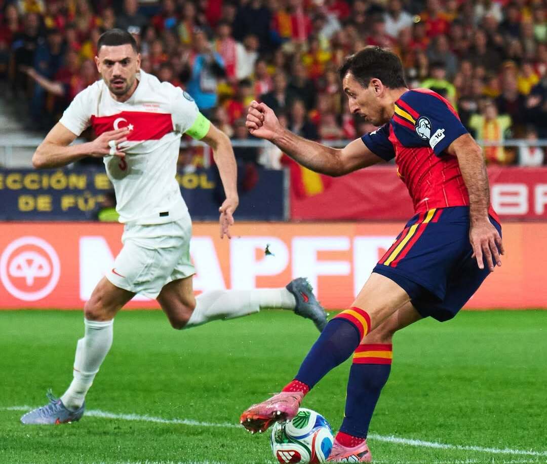 Aksi penyerang Spanyol, Mikel Oyarzabal, ketika akan mengirim umpan dalam laga menghadapi Turkiye. Rabu, 19 November 2025--instagram @sefutbol
