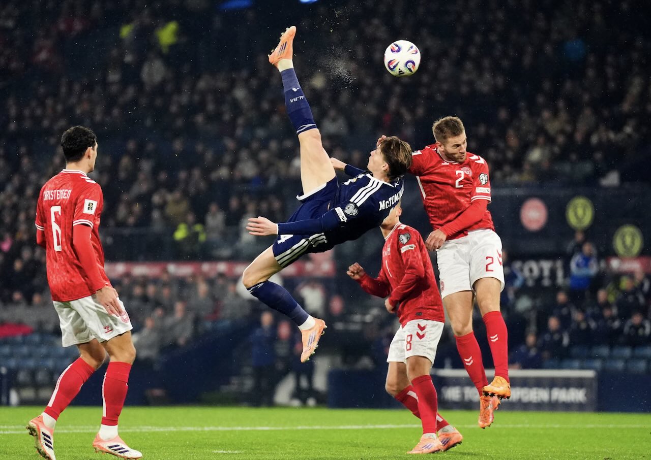 Skotlandia vs Denmark 4-2, Scott McTominay dkk lolos ke Piala Dunia 2026. Foto: McTominay melepaskan tendangan salto yang membuka skor, 19 November 2025.-Andy Buchanan-AFP