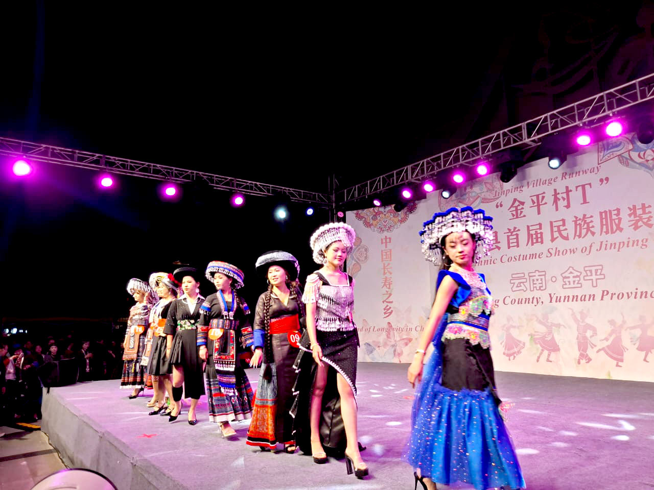 Panggung besar memendarkan cahaya warna-warni. Menimpa layar besar dengan tulisan berwarna merah: 1st Ethnic Costume Show of Jinping County.