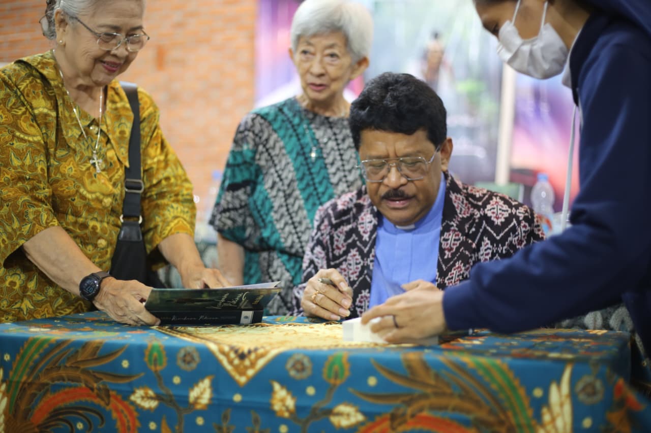 PATER FRITZ MEKO (tengah) saat menandatangani buku karyanya di bedah buku Kembara Pikiran, Jumat, 21 November 2025-Panitia bedah buku Fritz Meko-