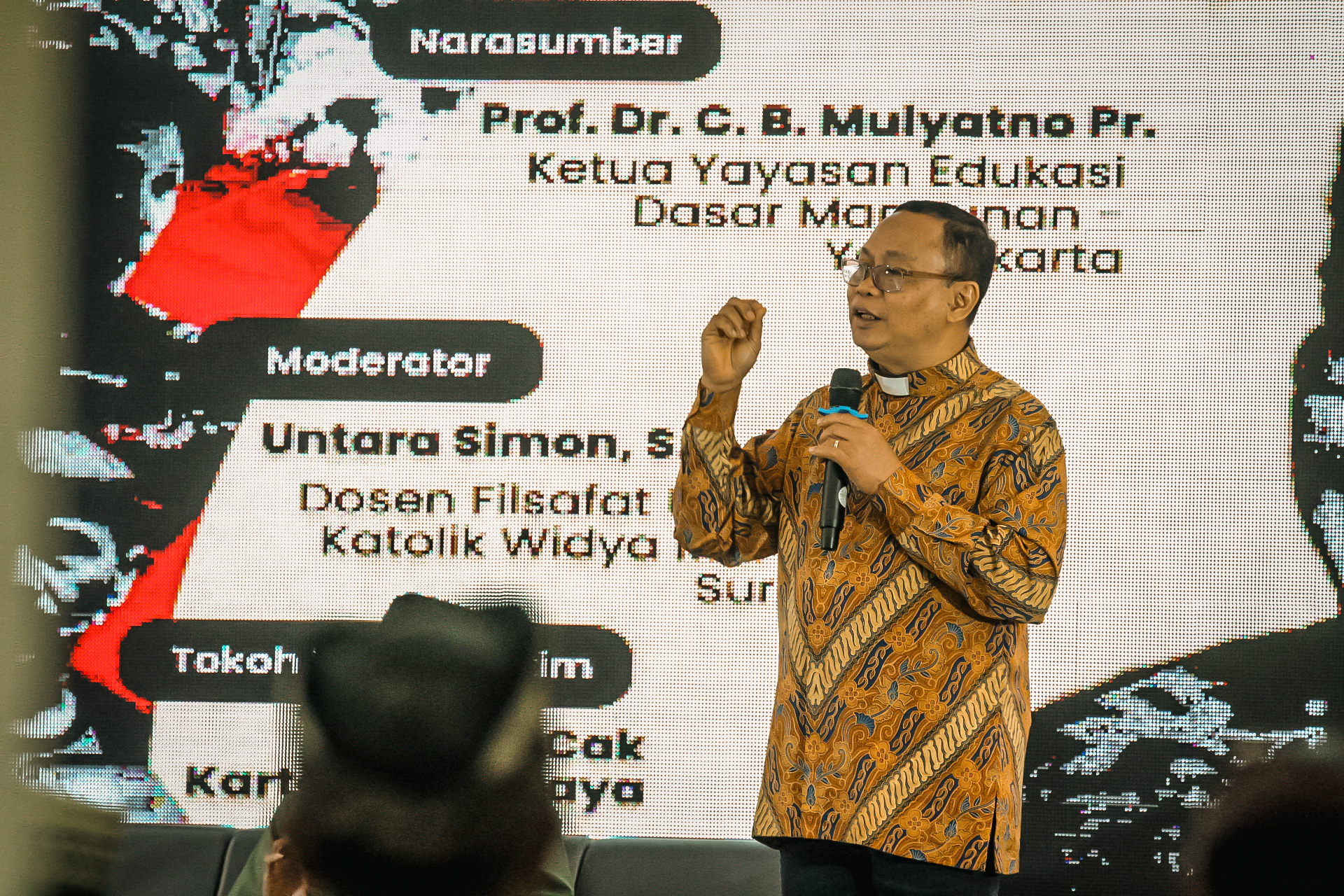 Prof. Dr. C. B. Mulyatno Pr. dalam acara Dialog Kebangsaan di Balai Paroki Gereja St. Yakobus, Citraland Surabaya, Jumat 21 November 2025.-Tirtha Nirwana Sidik-