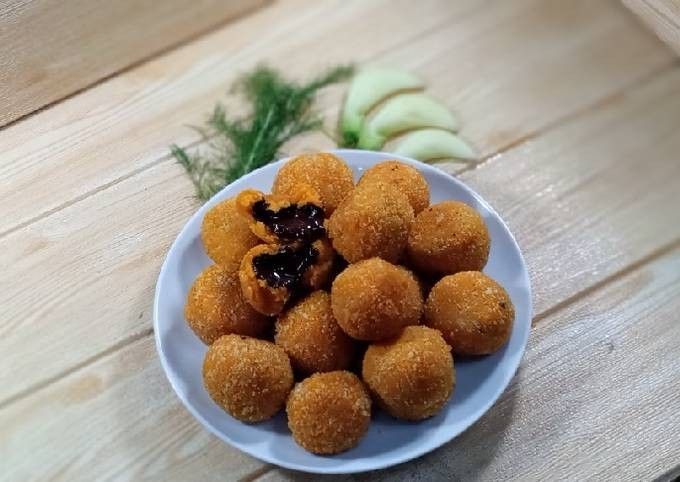 Ambil sedikit adonan, isi dengan potongan cokelat batangan, lalu bulatkan. Gulingkan pada tepung roti dan goreng hingga bagian luarnya garing.