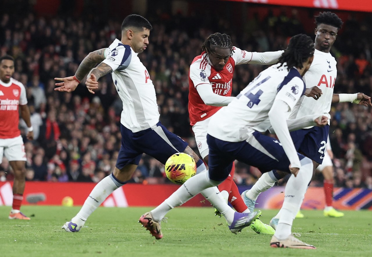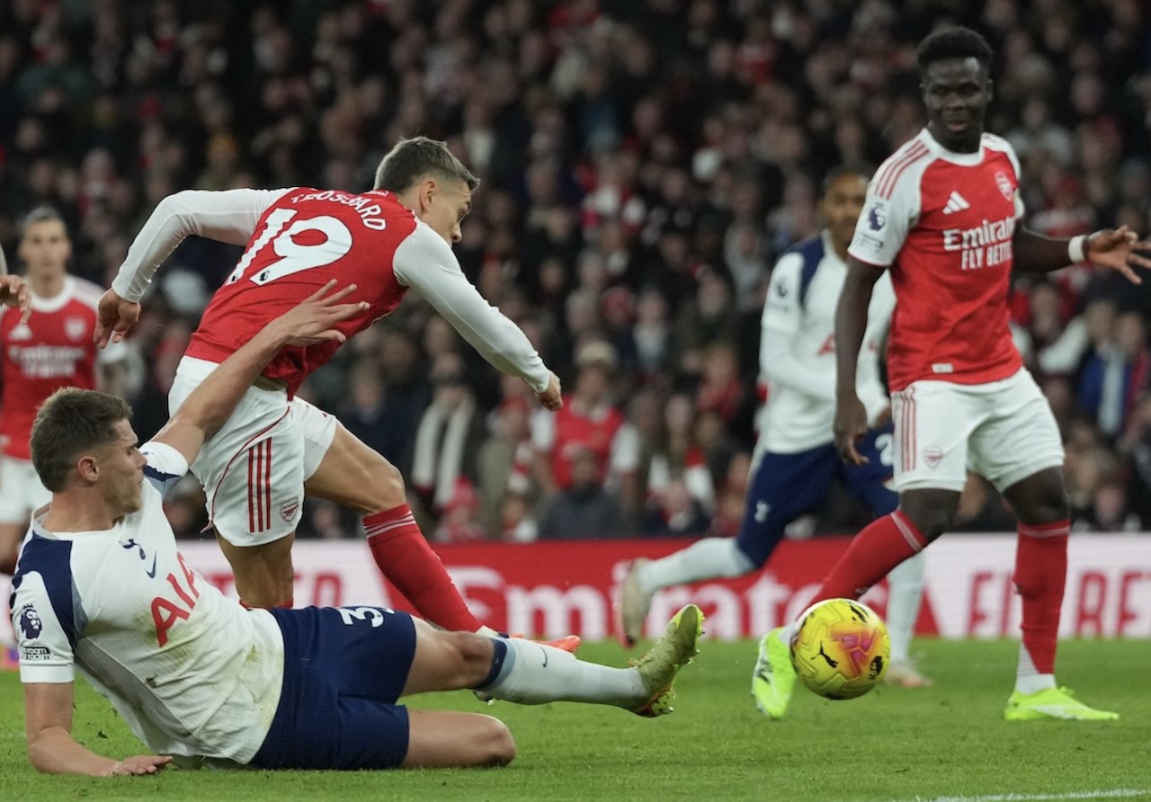 Peluang pertama langsung hadir di menit ke-3 ketika kombinasi Leandro Trossard–Bukayo Saka–Eberechi Eze membuka ruang untuk Declan Rice. Namun tembakan Rice diblok oleh kiper Spurs Guglielmo Vicario.