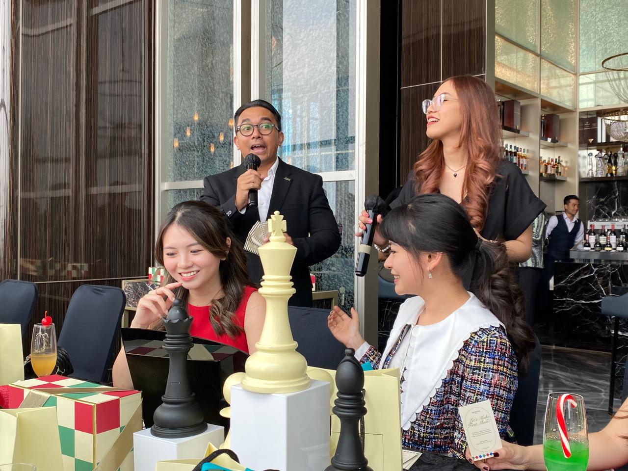 Gabrielle Wang (kiri) dan Ivi Santoso (kanan) yang tengah mengikuti sesi permainan Let's make the first move di acara Festive Season di The Westin Surabaya.-Nazwarahma-HARIAN DISWAY