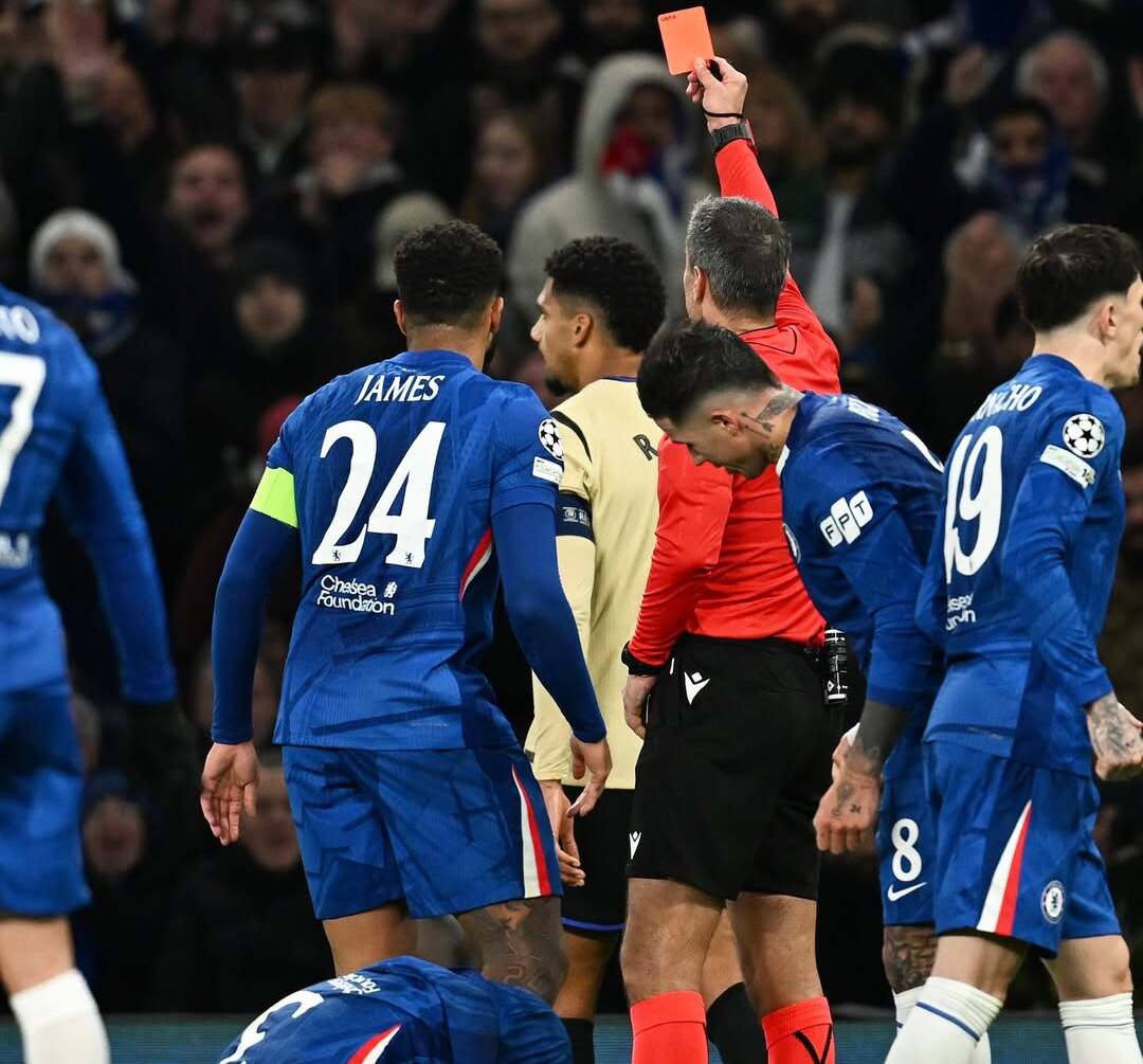 Potret bek Barcelona, Ronald Araujo (baju kuning), ketika mendapat kartu merah dalam laga kontra Chelsea. Rabu, 26 November 2025--Instagram @fabriziorom