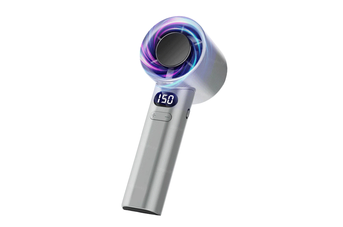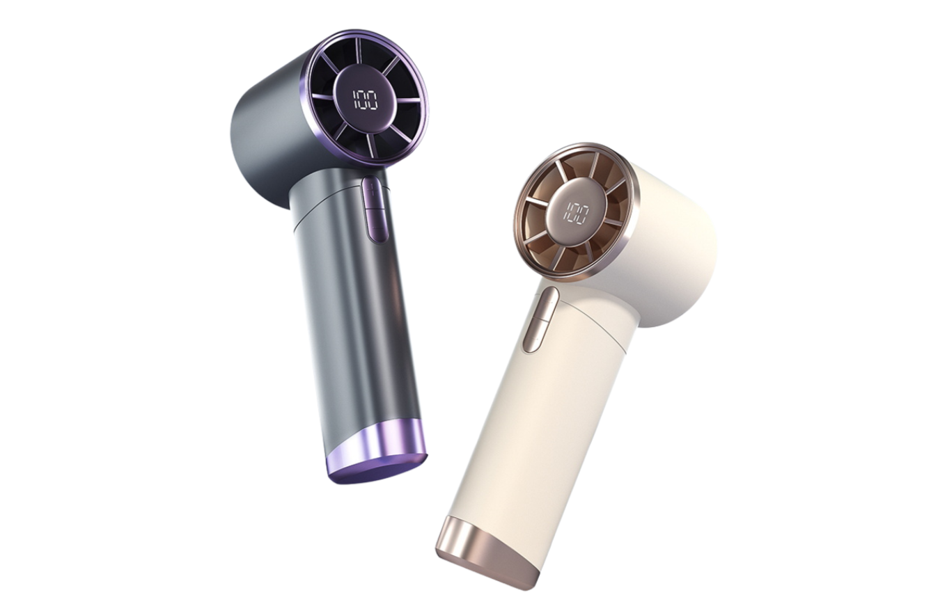 Desainnya compact dengan bilah tersembunyi, serta mampu berfungsi sebagai handheld maupun kipas meja.