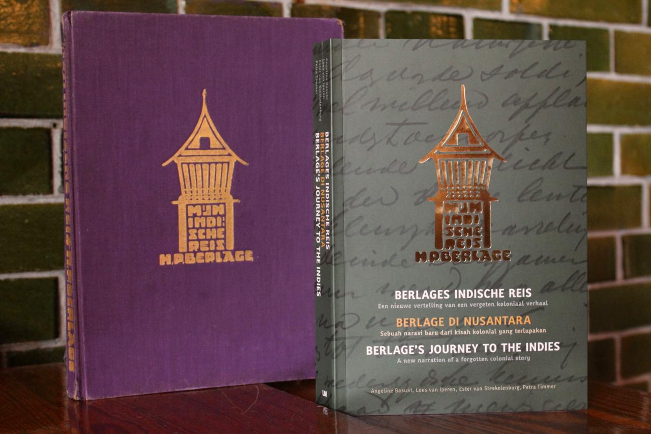 BERLAGE DI NUSANTARA dengan judul yang tertulis dalam tiga bahasa (kanan) dan buku yang menjadi rujukannya, Mijn Indische Reis.-Berlage di Nusantara untuk Harian Disway-