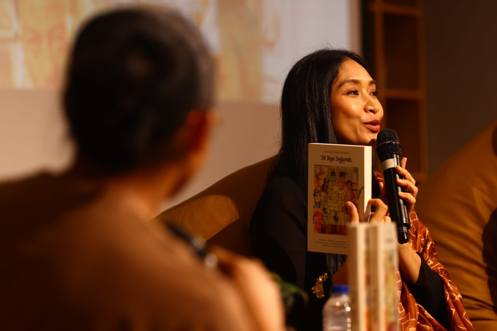 Happy Salma, founder Titimangsa sekaligus produser Di Tepi Sejarah, hadir dalam perilisan buku Antologi Naskah Monolog Di Tepi Sejarah, 27 November 2025 di Gramedia Jalma, Jakarta.