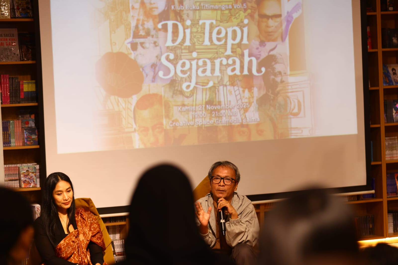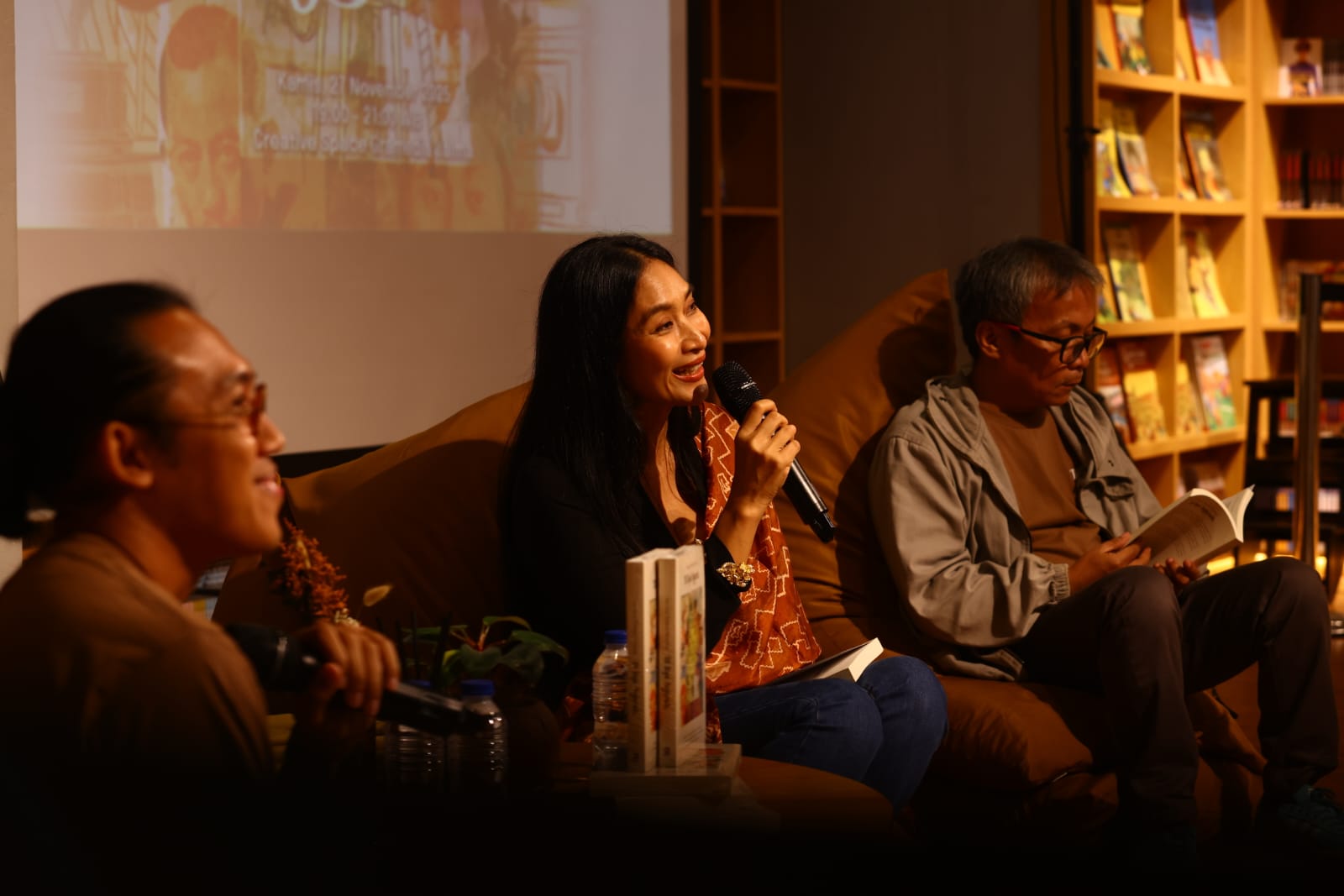 Suasana diskusi dalam perilisan buku Antologi Naskah Monolog Di Tepi Sejarah yang menghadirkan Happy Salma dan Ahda Imran, 27 November 2025.-Nadya Siregar-