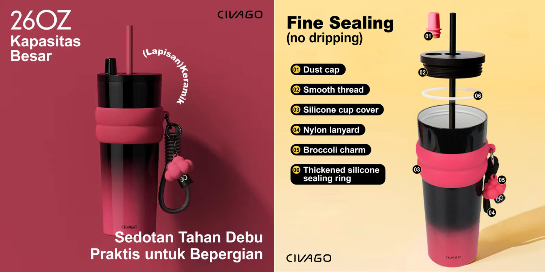Penutup antibocor, sedotan antidebu, serta desain ergonomis meningkatkan kenyamanan. Material inner ceramic juga memberi sensasi minum yang lebih bersih dan tidak meninggalkan aftertaste.