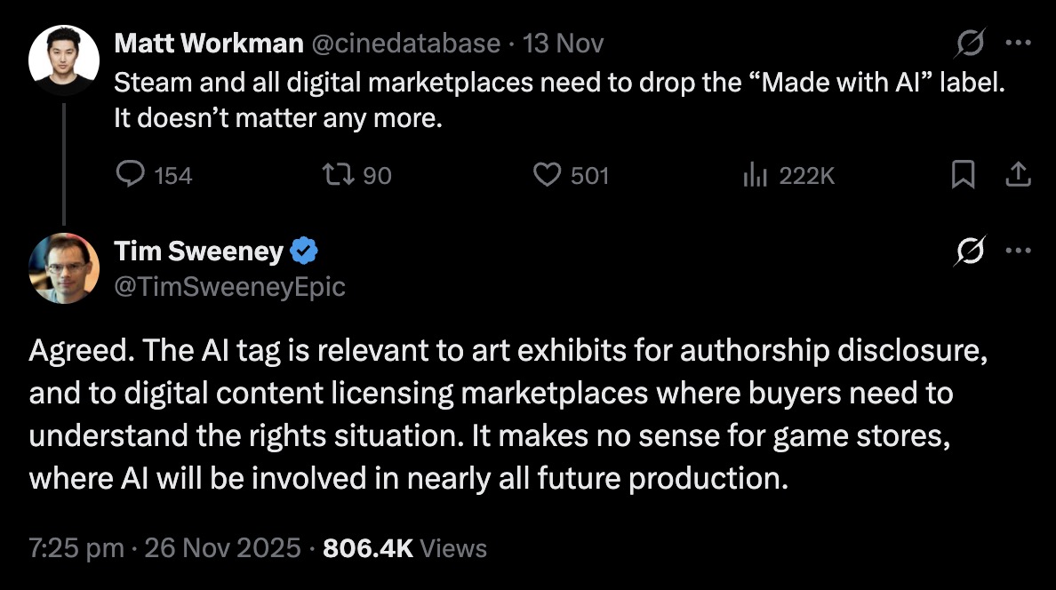Label tersebut nantinya akan berbunyi "made with AI".  CEO Epic Games, Tim Sweeney, menolak gagasan bahwa toko gim digital semacam Steam perlu memberi label tersebut.
