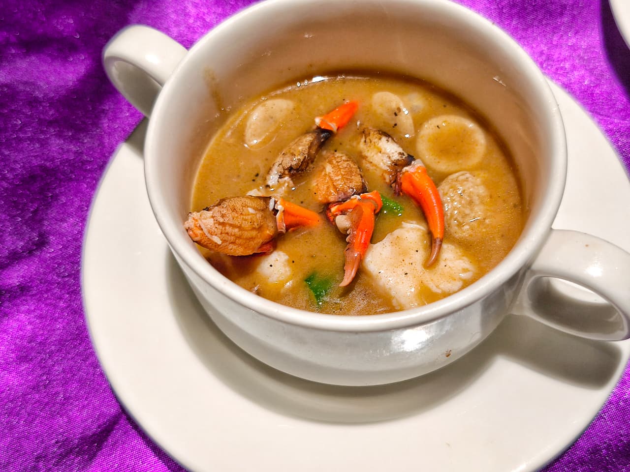 Kepiting, udang, dan sosis berpadu dengan kuah umami. Sup khas New Orleans. Makanan itu mirip dengan masakan Indonesia. Dimakan bersama dengan nasi putih.