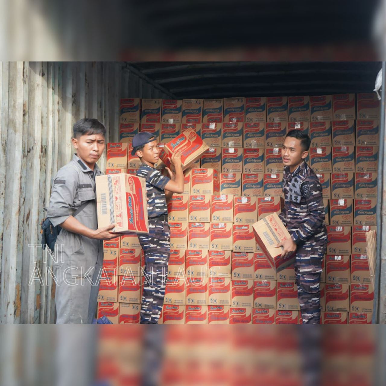 TNI Angkatan Laut sedang memuat bantuan logistik ke Kapal Perang Republik Indonesia (KRI) yang akan dikirim ke lokasi bencana di Aceh, Sumatera Utara, dan Sumatera Barat, pada Minggu, 30 November 2025.--TNI AL