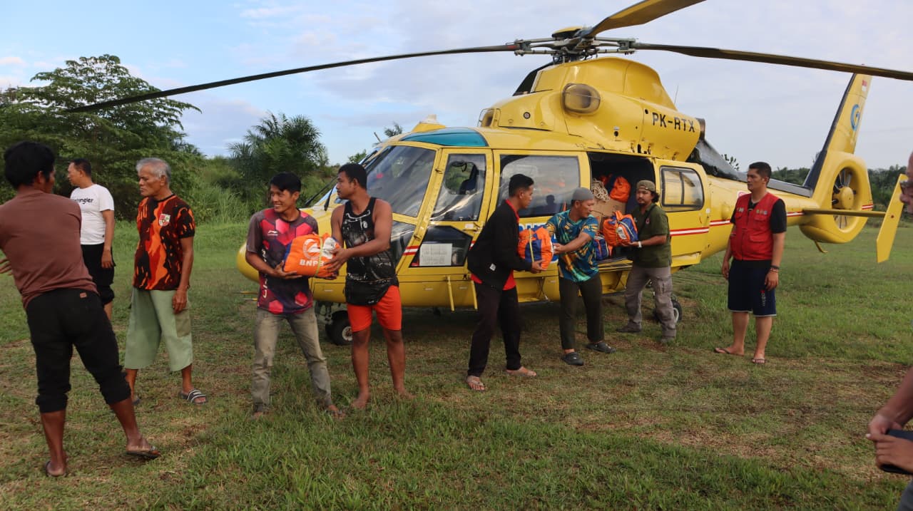 Helikopter BNPB melakukan dropping bantuan logistik dan peralatan di lapangan Kecamatan Karangbaru, Kabupaten Aceh Tamiang, Aceh-BNPB-