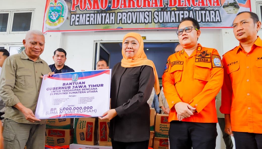 Penyerahan dilakukan di Posko Bencana Kwarda Sumatera Utara, Medan, dan diterima langsung oleh Wakil Gubernur Sumut Surya. “ Atas nama Pemerintah Provinsi dan seluruh masyarakat Jawa Timur, kami menyampaikan duka mendalam atas musibah ini,” kata Khofifah.