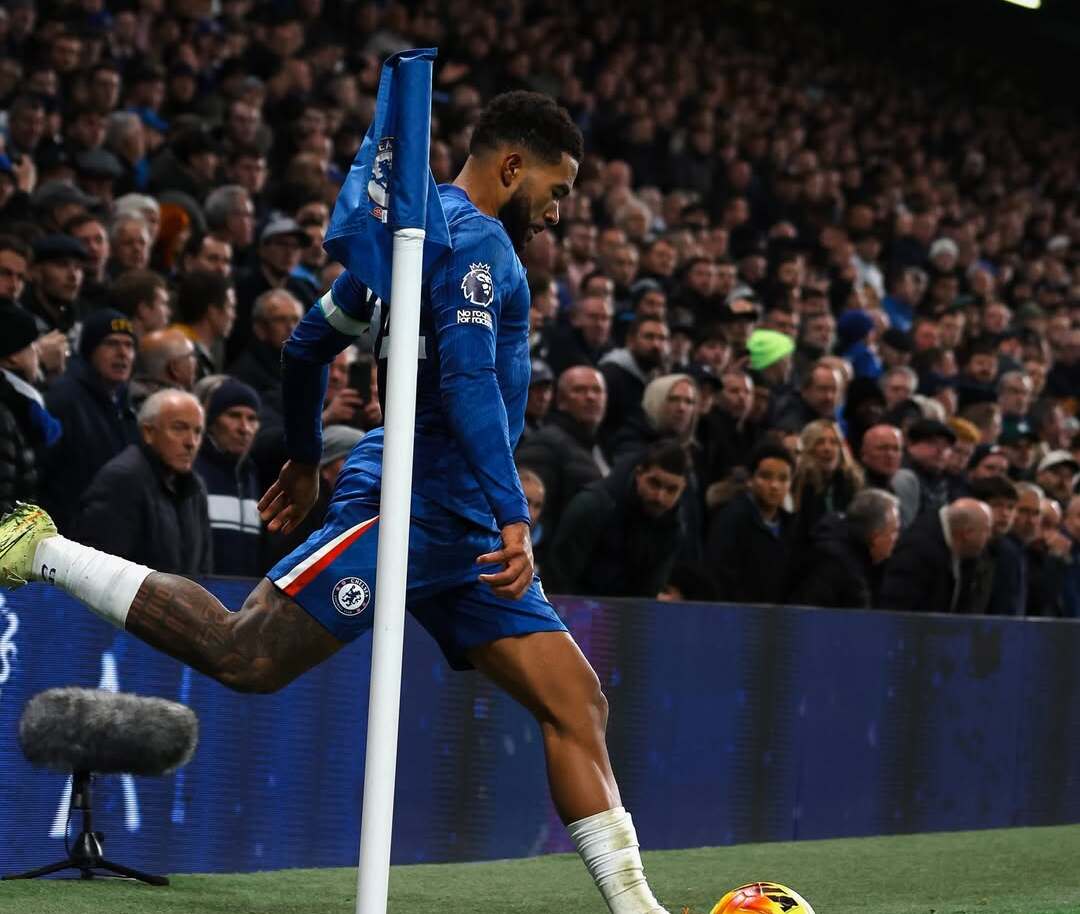 Momen bek sekaligus kapten Chelsea, Reece James, ketika melakukan tendangan sudut dalam laga kontra Arsenal. Minggu, 30 November 2025--Instagram @chelseafc
