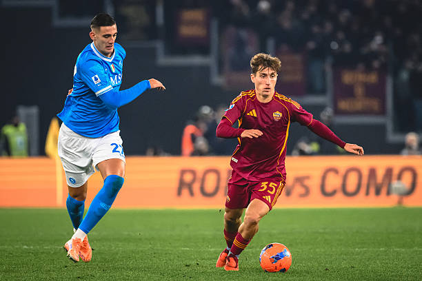 Aksi Tommaso Baldanzi (kanan) ketika AS Roma menjamu Napoli, Senin, 1 Desember 2025-Getty Images-