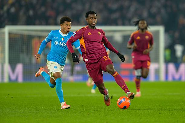 Evan Ndicka (kanan) mengawal pergerakan David Neres di laga AS Roma vs Napoli, Senin, 1 Desember 2025-Getty Images-