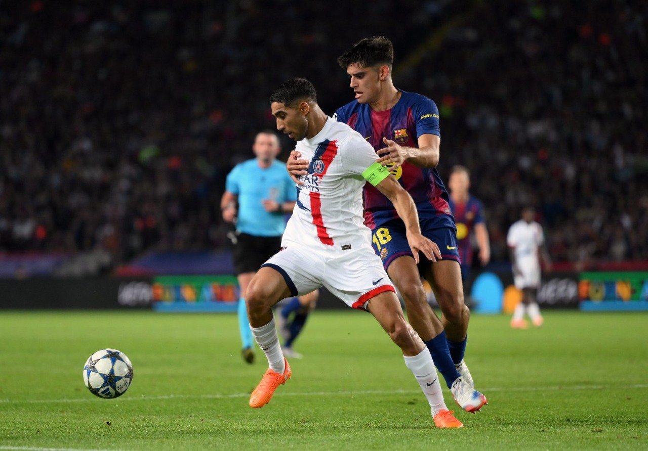 Momen Gerard Martin (kanan) berduel dengan Achraf Hakimi (kiri) dalam laga Barcelona vs PSG di Liga Champions-David Ramos-Getty Images