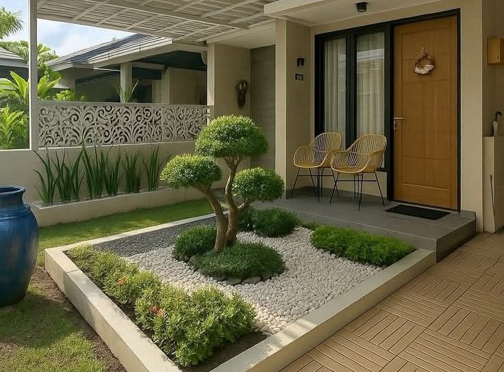 Kombinasi rumput hijau, batu koral, serta satu hingga dua tanaman hias sudah cukup untuk menciptakan tampilan yang rapi dan bersih.