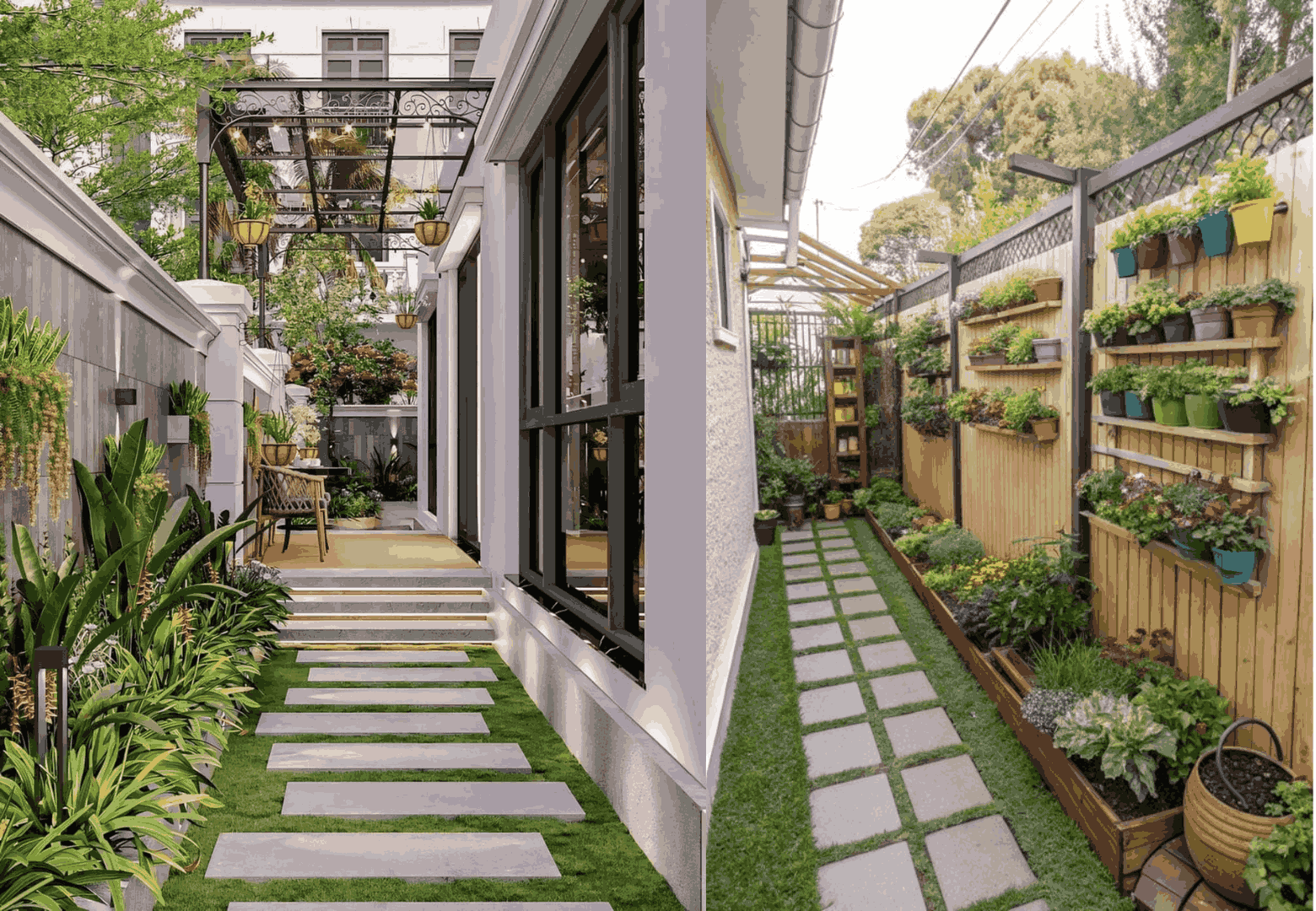 Area samping rumah yang sempit namun memanjang dapat dimanfaatkan sebagai jalur hijau yang fungsional.