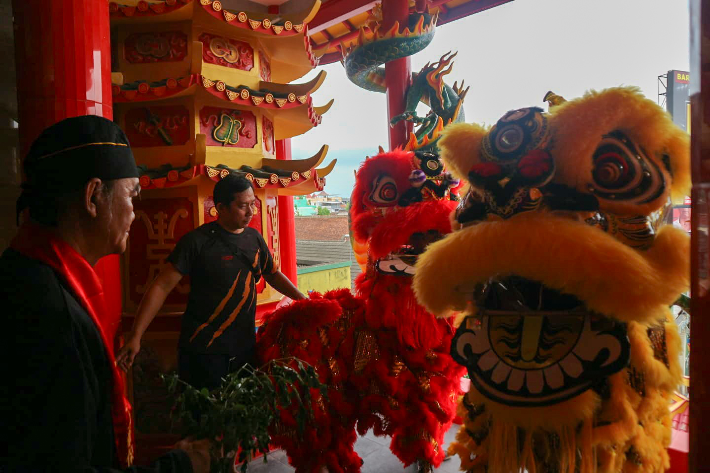 Prosesi pembersihan bangunan baru Kelenteng Poo An Kiong Blitar. Tampak dua barongsai sebagai bagian dari ritual tersebut.-Guruh D.N.-