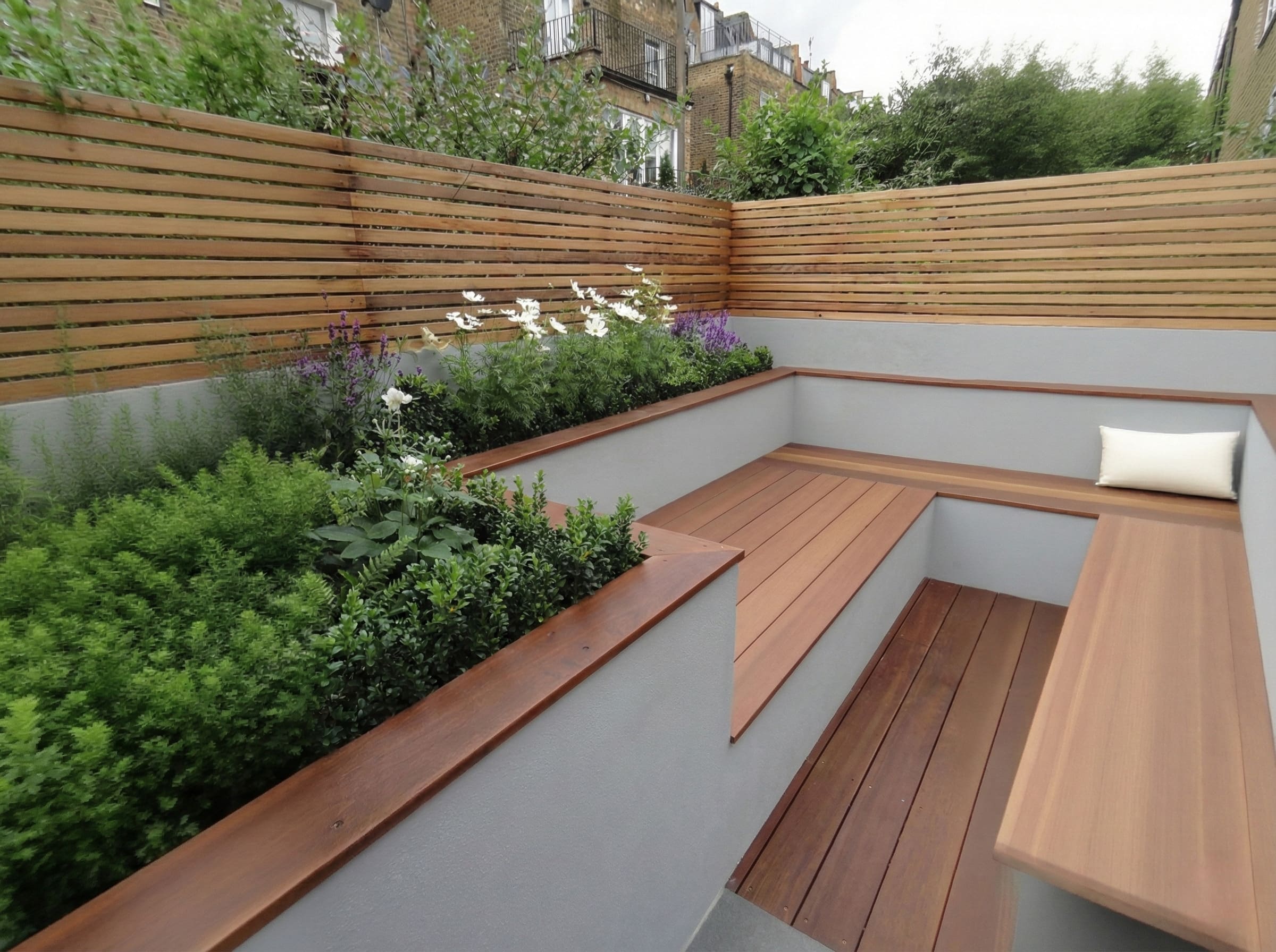Bangku kayu yang menyatu dengan planter box memberi ilusi ruang yang lebih luas sekaligus memaksimalkan fungsi.