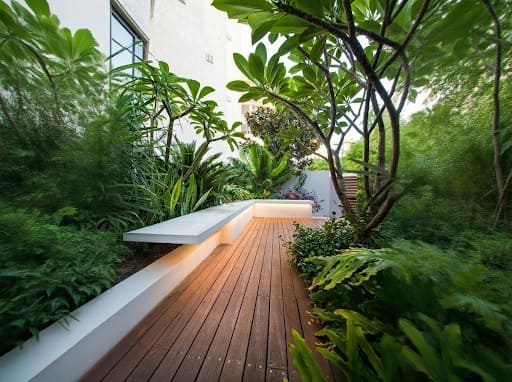 Kombinasi material kayu dan beton bisa memberikan kesan modern, bersih, dan cocok untuk nuansa tropical. Bangku beton melayang (floating bench) menjadi elemen yang unik sekaligus fungsional karena terlihat ringan meski terbuat dari material solid.