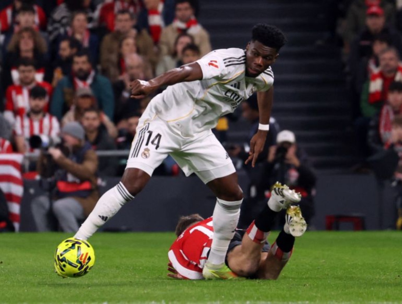 Aksi Tchouameni dalam laga tandang Real Madrid lawan Athletic Bilbao, lanjutan Liga Spanyol 2025/2026 pekan kelimabelas, Kamis dini hari WIB, 4 Desember 2025.-Juan Manuel Serrano Arce-Getty Images