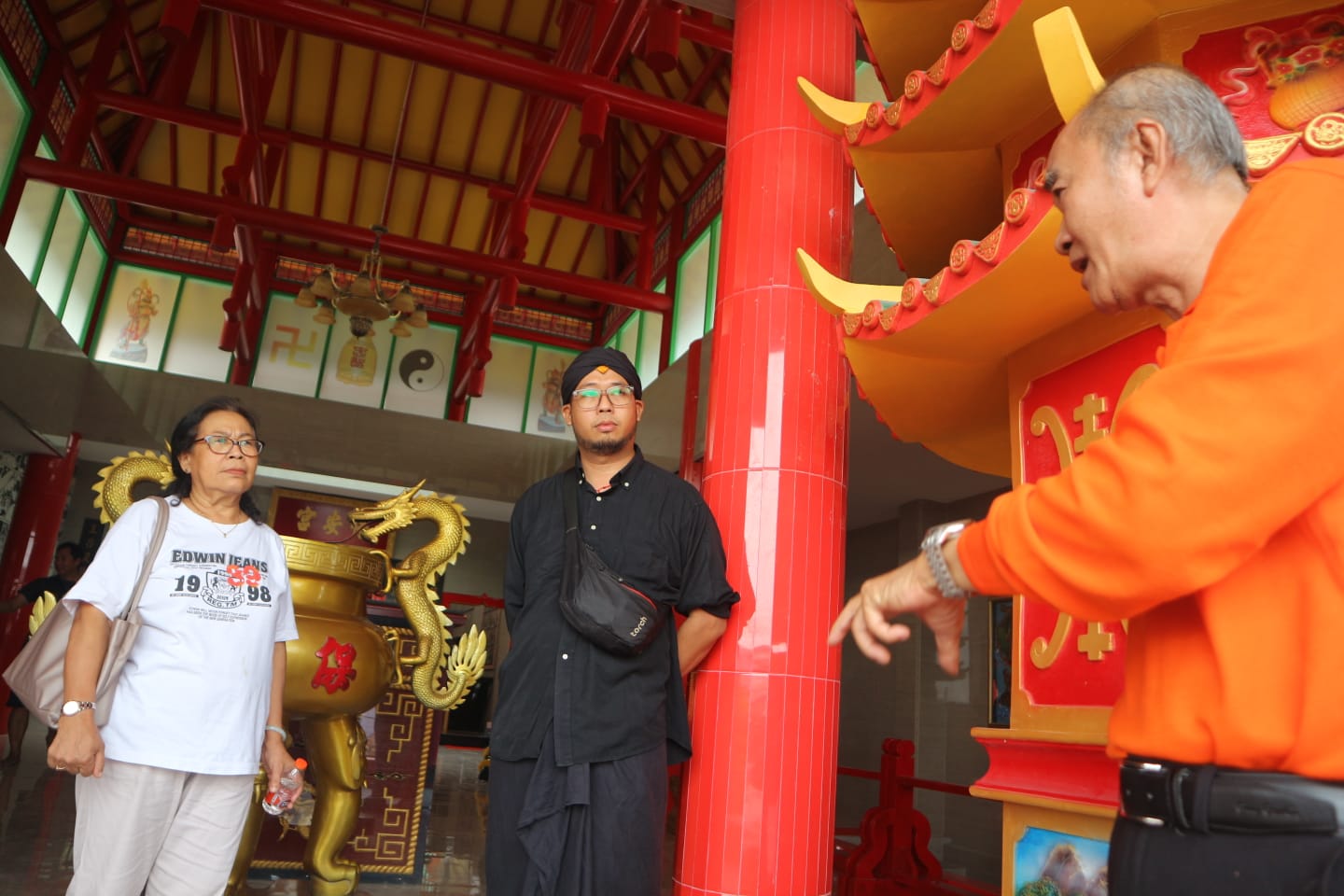 Ws Liem Tiong Yang (kanan) berbincang dengan Xs Endang Titis dan Panji Waskito di Kelenteng Poo An Kiong, 4 Desember 2025. Di belakang mereka terdapat hio lo dengan ornamen naga berjari empat.-Guruh D.N.-HARIAN DISWAY