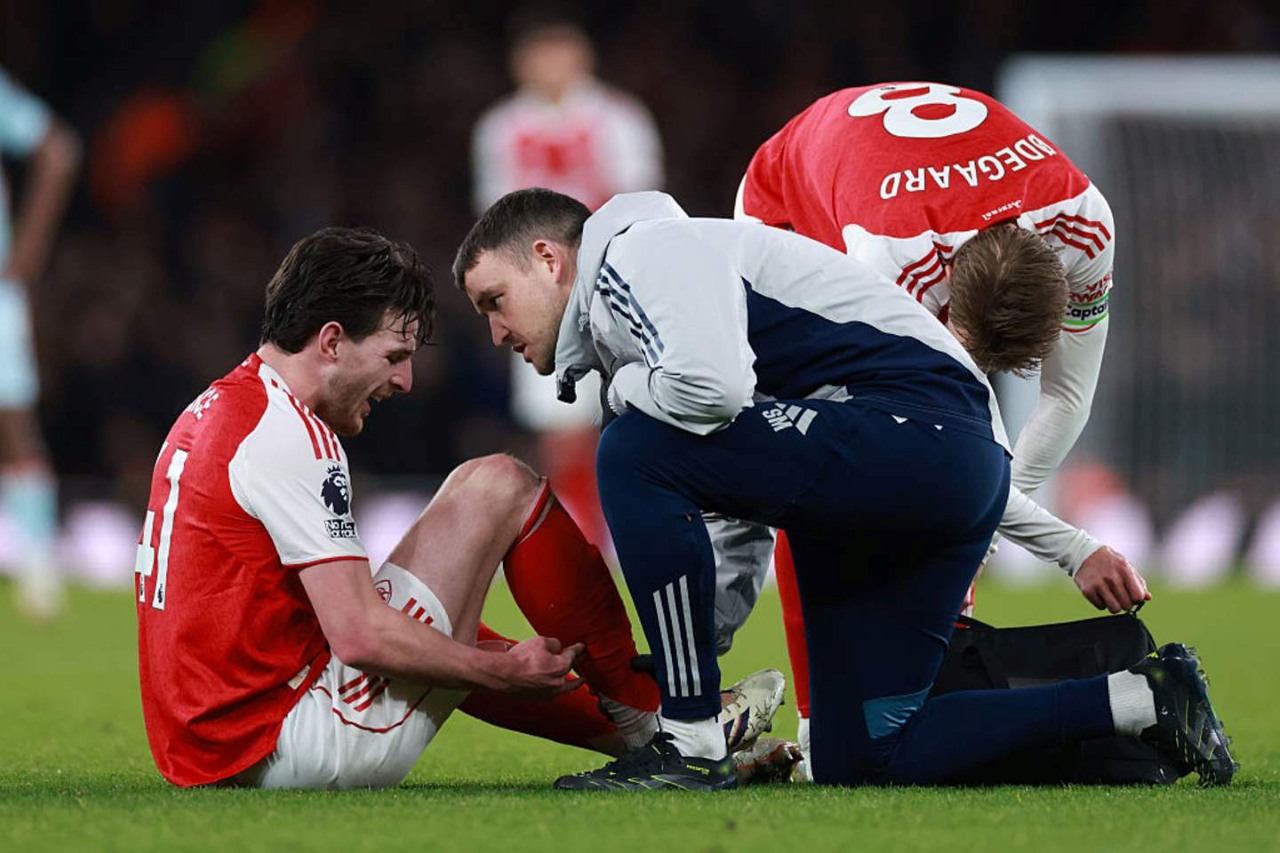 Declan Rice terlihat kesakitan dan mengalami cedera ketika laga Arsenal lawan Brentford pada laga 4 Desember 2025 lalu-Marc Atkins-Getty Images