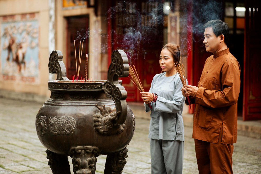 Ilustrasi dua orang sedang bersembahyang menggunakan dupa.-freepik-
