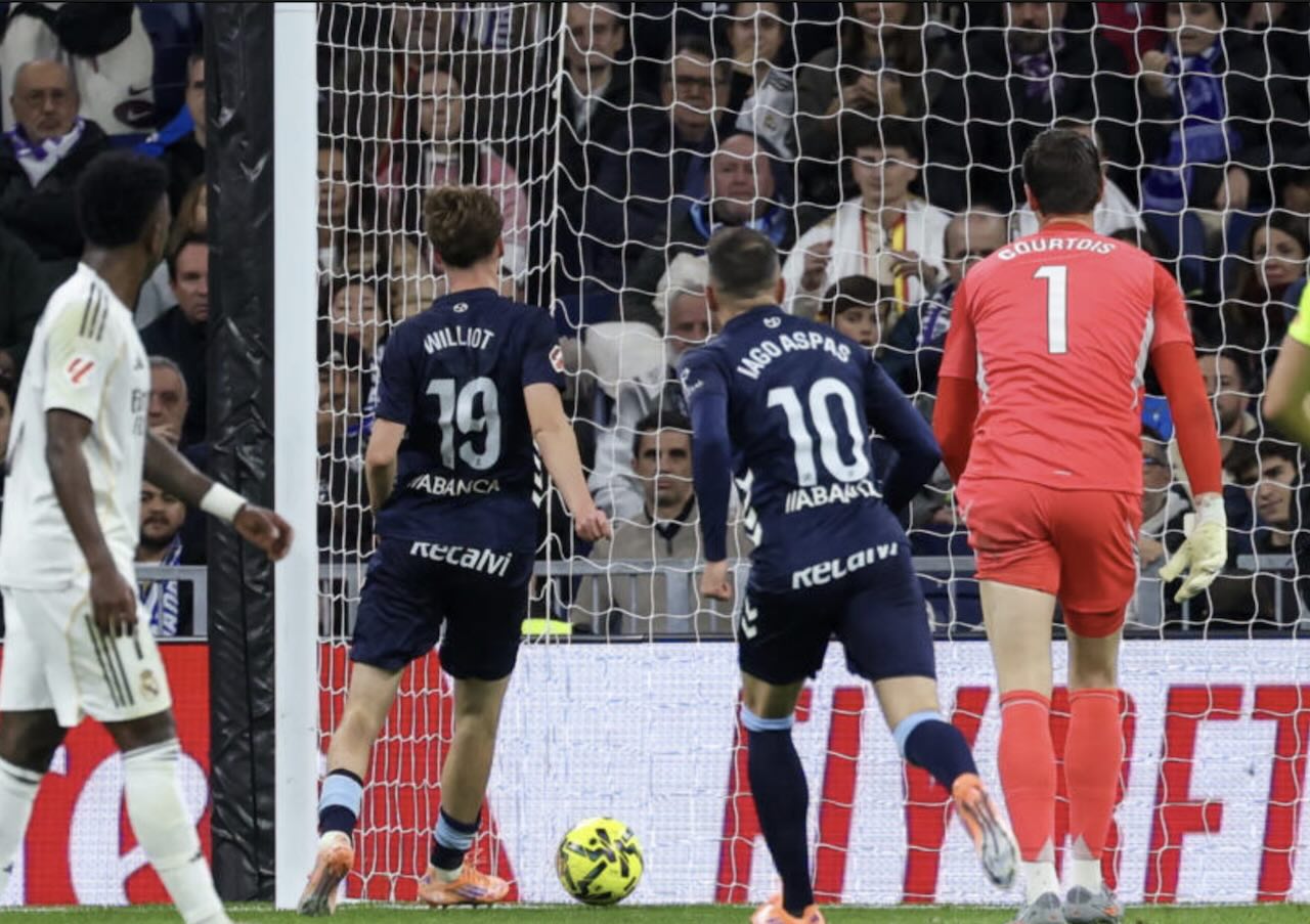 Real Madrid vs Celta Vigo 0-2, Swedberg dan dua kartu Merah Jadi mimpi buruk Los Blancos. Foto: Willot Swedberg (no 19) menjebol gawang Thibaut Courtois untuk kali kedua, 8 Desember 2025. -Thomas Coex-AFP