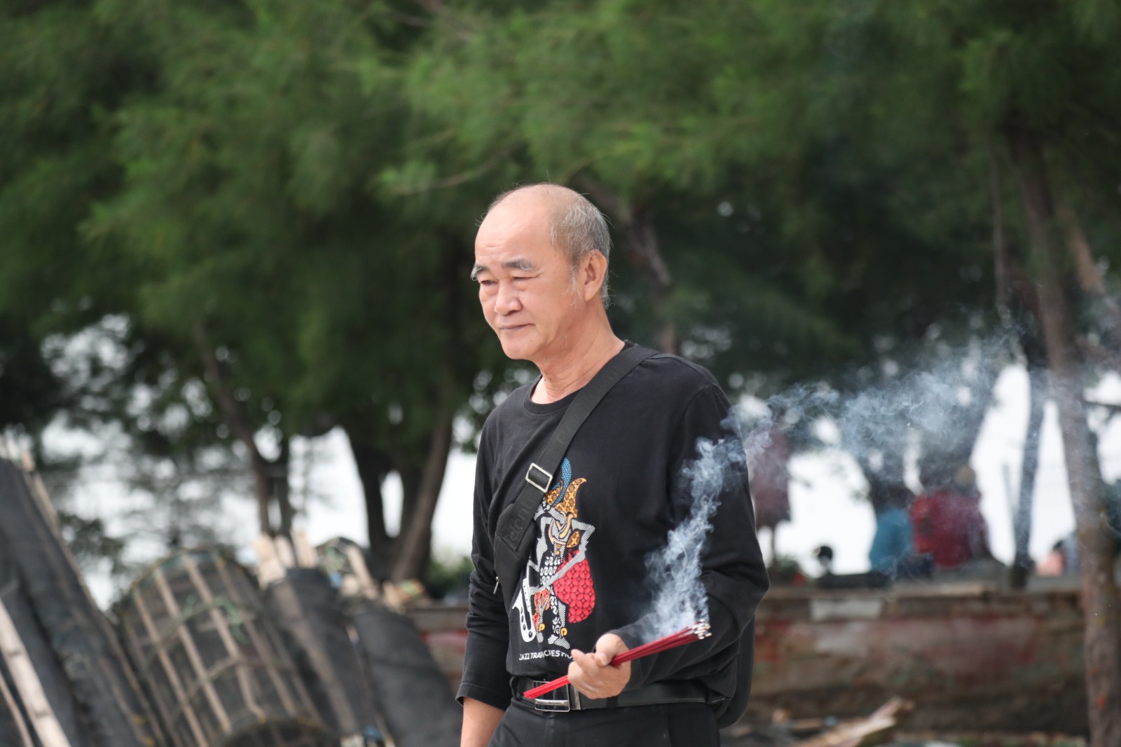 Ws. Liem Tiong Yang saat hendak memimpin ibadah cisuak pada Februari 2025. Tampak di tangannya ia memegang tiga batang dupa.-Boy Slamet-HARIAN DISWAY