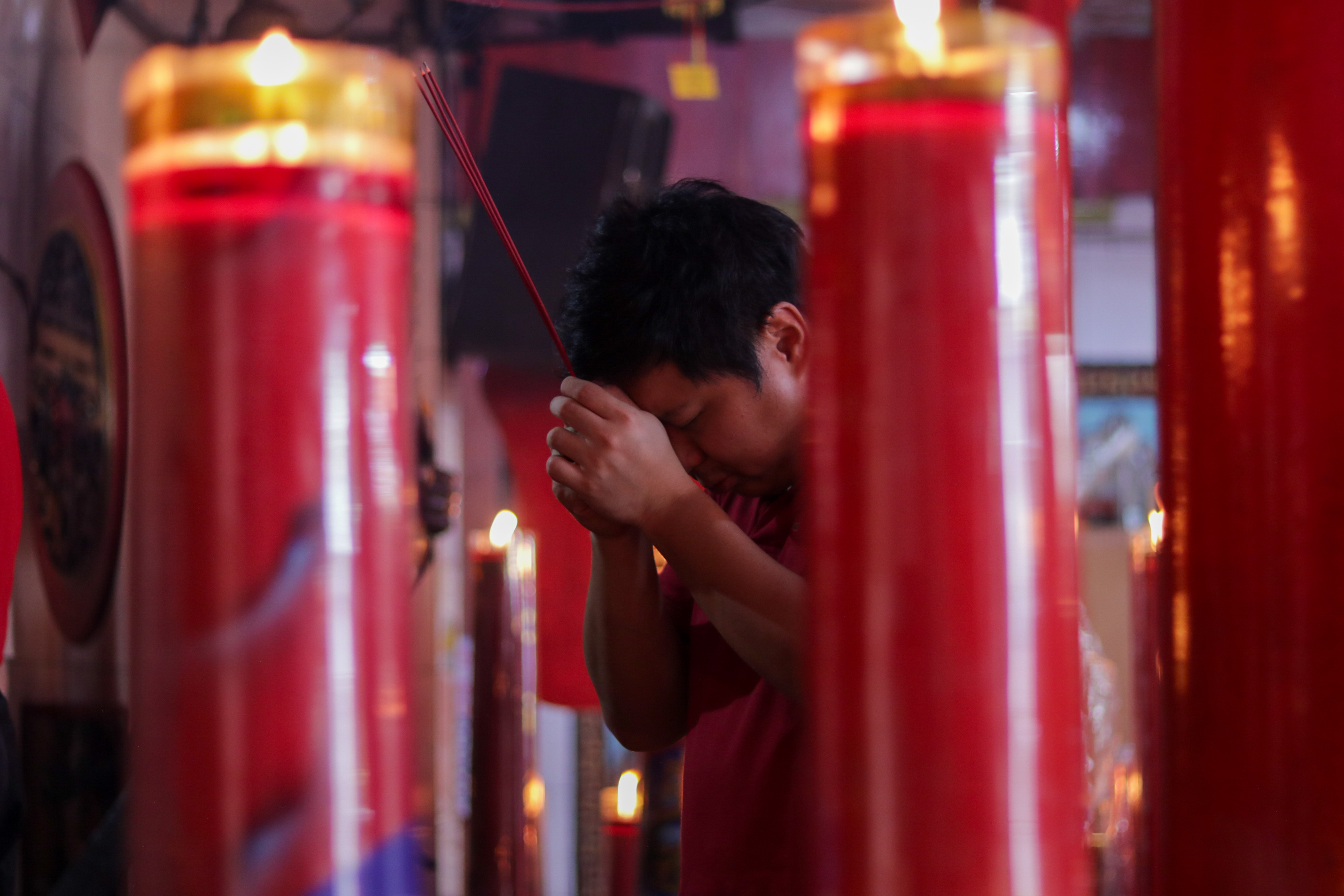Seorang umat beribadah menggunakan dupa. Dalam tradisi Tionghoa terdapat beragam jenis dupa dan tata cara bersembahyang menggunakan sarana tersebut.-Julian Romadhon-HARIAN DISWAY