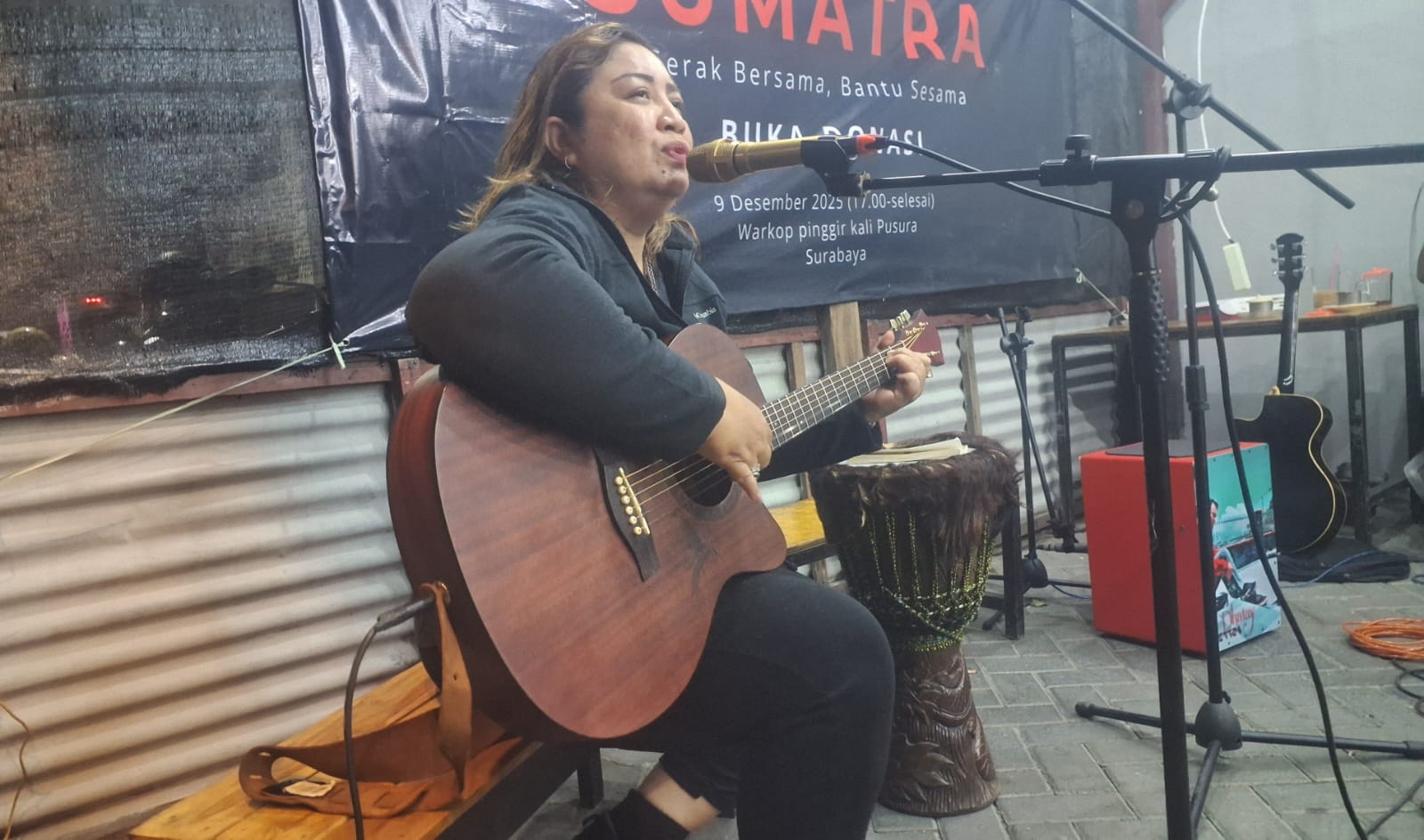 Penampilan Rella Mart dalam ajang Pinggir Kali untuk Sumatra yang digagas Komunitas Jurnalis Riverside, 9 Desember 2025.-Guruh D.N.-HARIAN DISWAY