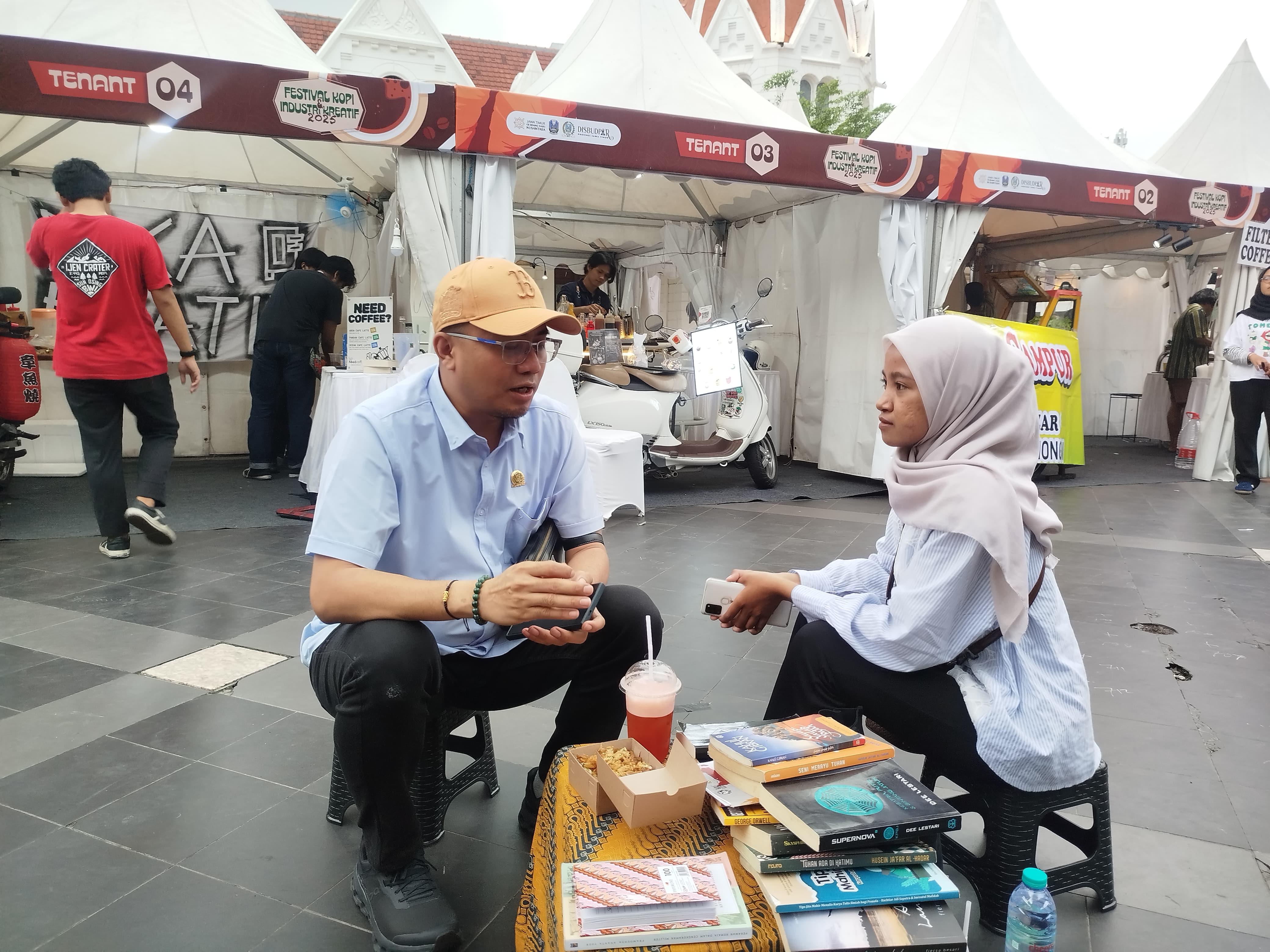 Anggota Komisi B DPRD Kota Surabaya Yuga Pratisabda Widyawasta berbincang dengan pelaku UMKM dalam Festival Kopi & Industri Kreatif 2025 yang digelar selama dua hari, 8-9 Desember 2025.-Amelia P.N.-