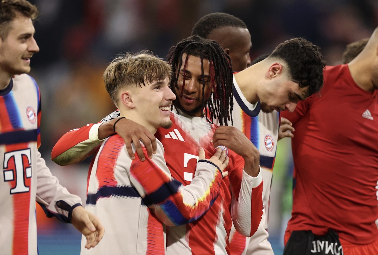 Bayern vs Sporting 3-1, Die Roten comeback dalam 13 menit. Foto: Lennart Karl merayakan kemenangan Bayern bersama para pemain Bayern, 10 Desember 2025. -Alexandra Beier-AFP