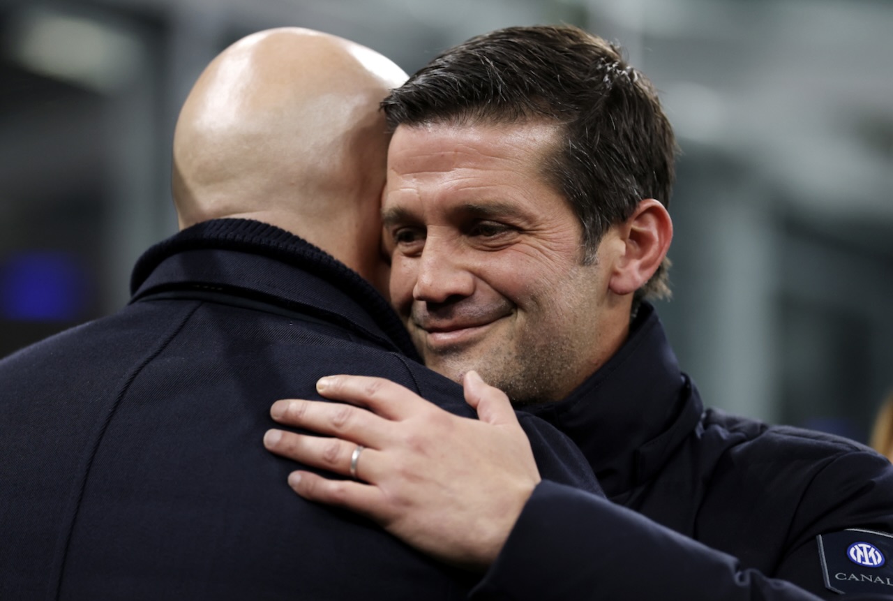 Inter kalah oleh gol penalti, Christian Chivu curiga Florian Wirtz diving. Foto: Chivu berpelukan dengan Arne Slot usai pertandingan, 10 Desember 2025.-Stefano Relandini-AFP