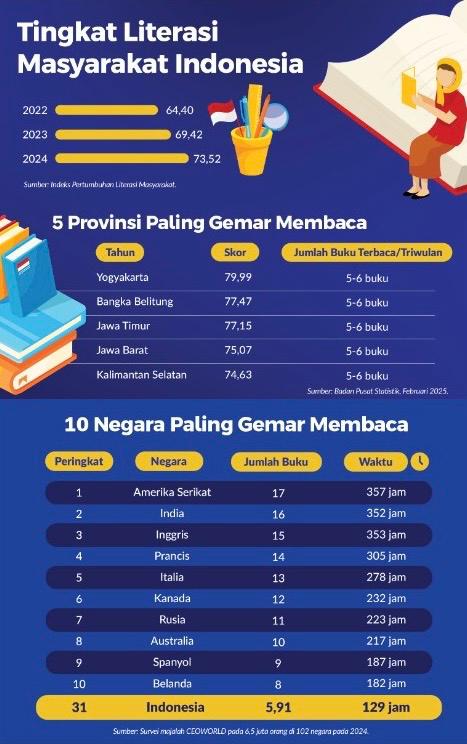 Meski Indeks Pertumbuhan Literasi Masyarakat mencatat kenaikan skor dalam dua tahun terakhir, namun belum cukup untuk menggeser Indonesia dari status negara dengan kemampuan baca rendah. Apalagi jauh di bawah Singapura dan negara-negara yang berhasil membangun budaya membaca kuat.