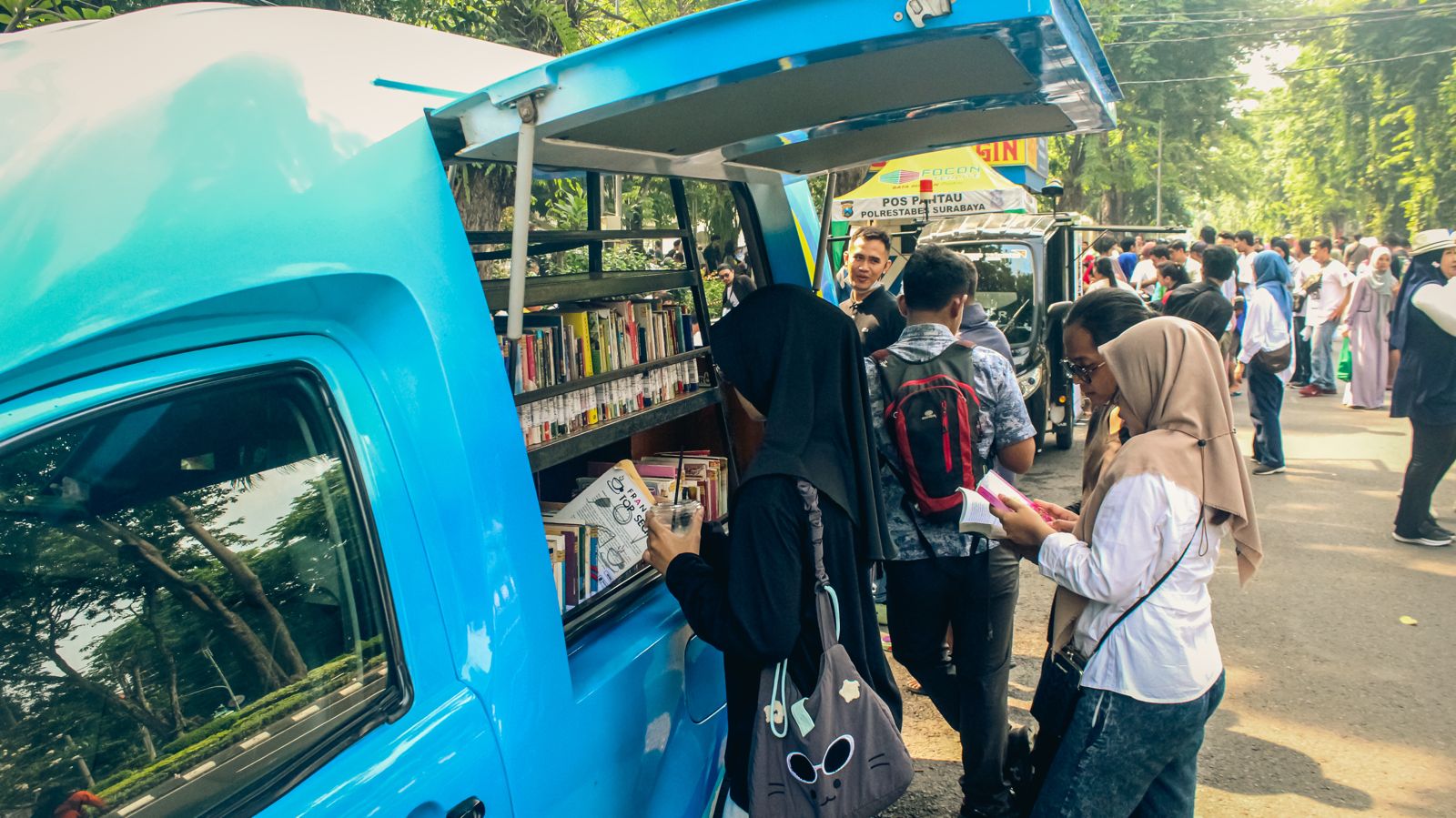 Anak-anak muda masih gemar membaca buku yang difasilitasi oleh perpustakaan keliling saat CFD di Taman Bungkul Surabaya, Minggu, 7 Desember 2025.-Tirtha Nirwana Sidik for Harian Disway-