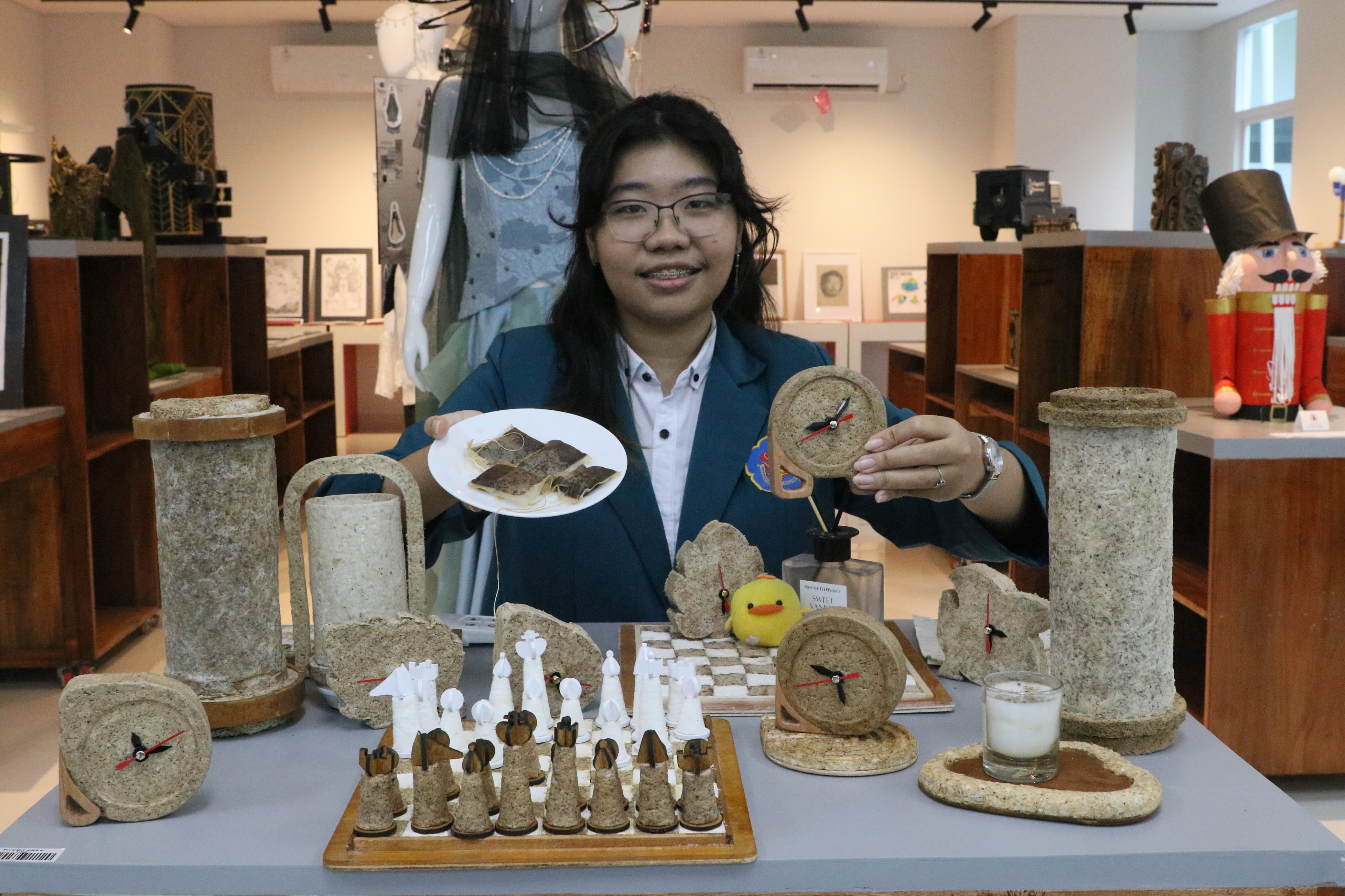 Mahasiswa Ubaya Jeanne Theresia Mintarja menciptakan produk bernilai guna dari kantung teh.-Sindhy Nurhaliza-HARIAN DISWAY