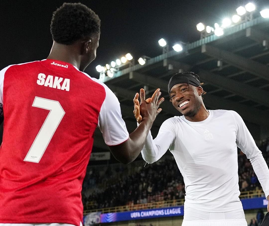 Dua penyerang Arsenal, Bukayo Saka (kiri) dan Noni Madueke (kanan), bersalaman usai meraih kemenangan atas Club Brugge. Kamis, 11 Desember 2025.--Instagram @arsenal