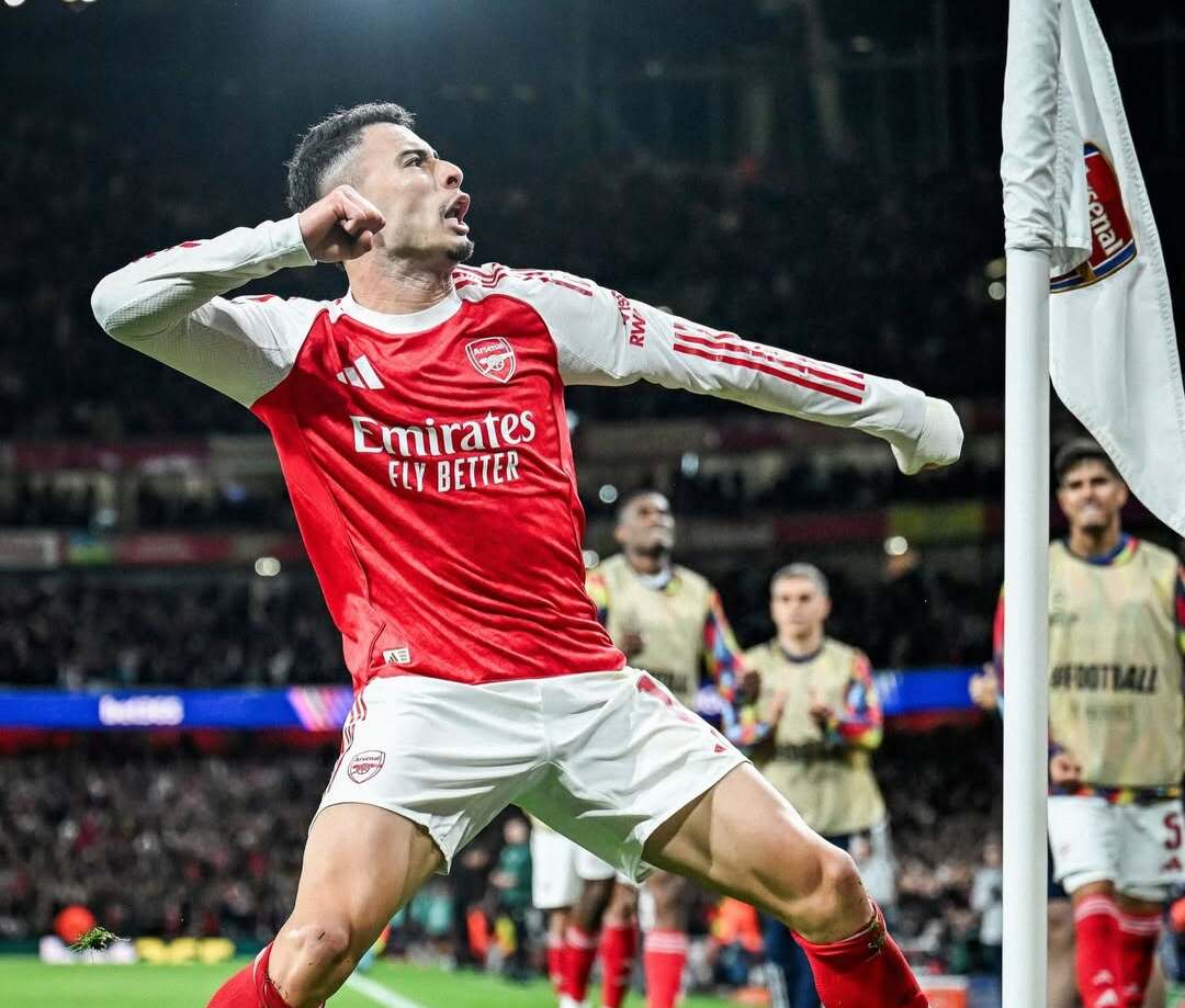 Momen winger Arsenal, Gabriel Martinelli, melakukan selebrasi usai mencetak gol dalam laga menghadapi Club Brugge. Kamis, 11 Desember 2025--Instagram @arsenal