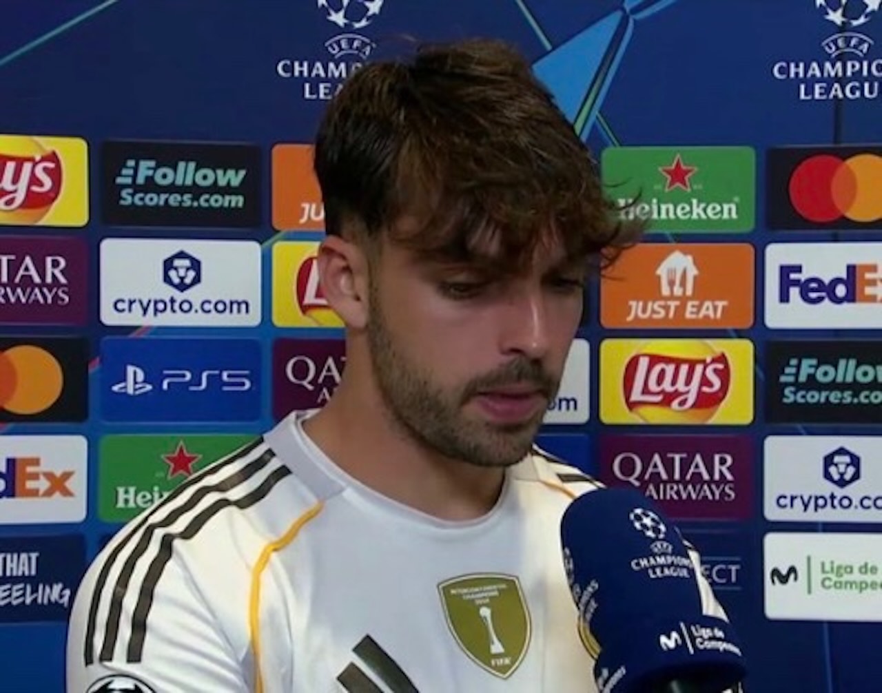 Xabi Alonso batal Dipecat meski Real Madrid kalah, ini kata pemain. Foto: Raul Asencio menunjukkan dukungan buat Xabi di mixed zone Bernabeu, 11 Desember 2025. -Real Madrid TV-