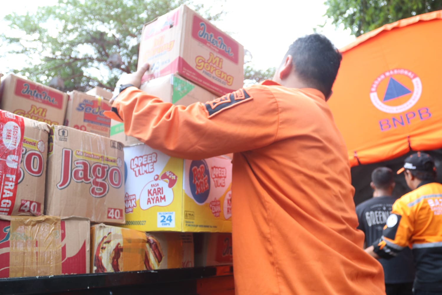 Anggota BNPB Surabaya menurunkan bantuan yang akan disalurkan kepada korban bencana di Sumatra.-Boy Slamet-