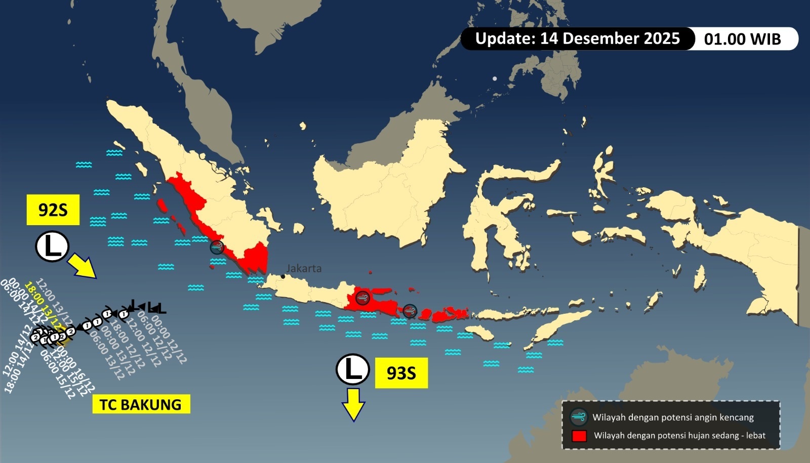 BMKG menyampaikan bahwa dampak tidak langsung Siklon Tropis Bakung dan Bibit Siklon Tropis 93S berpotensi memengaruhi kondisi cuaca ekstrem serta perairan di sejumlah wilayah Indonesia dalam periode 24 jam hingga 15 Desember 2025 pukul 07.00 WIB.